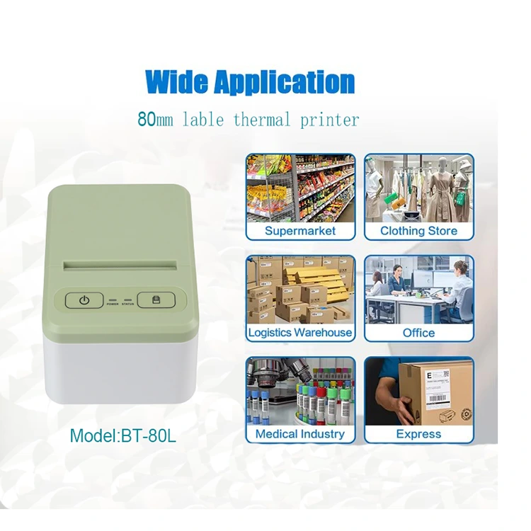 Renkli termal etiket yazıcımızın tasarım konsepti, müşterilerin onu fabrika depo sistemlerinde, küçük etiketler basması gereken küçük perakende mağazalarda, küçük etiketler, barkodlar, sevkıyat işaretleri, çıkartmalar vb. yazdırmak için kullanmalarına olanak sağlamaktır. 80L modeli, 20 ila 80 mm arasındaki genişliklerde yazdırmayı destekleyerek, farklı ihtiyaçları olan çeşitli müşteriler için uygun hale getirir. Boyut olarak kompakt olacak şekilde tasarlanmıştır, bu da taşımayı ve yerleştirmeyi kolaylaştırır.